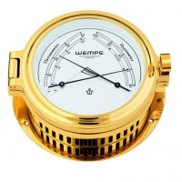 WEMPE Bullaugen Comfortmeter (bestehend aus Hygro- und Thermometer), Gehäuse aus massivem Messing Ø 140 mm, hochglanzpoliert und farblos lackiert, Zifferblatt weiß.Abmessungen: